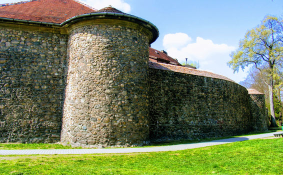 Zlokalizowanie miasta na wyspach w widłach ujścia Szprotawy do Bobru stanowiło pierwszą naturalną linię obrony. Wędrując promenadami starego Parku Goepperta doskonale czytelne są założenia dawnej twierdzy. Na dole pełniąca rolę fosy dolina Szprotawy, na górze posępne kamienne mury obronne. Ważna w systemie obronnym fosa była niegdyś szersza i sięgała bliżej murów. W mury wpleciono strategiczne baszty i basteje. Do twierdzy wjeżdżało się tylko przez dwie silnie ufortyfikowane bramy – Żagańską i Głogowską. Relikty tej pierwszej możemy podziwiać do dziś.